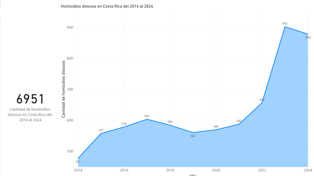 Históricamente conocido por su paz, Costa Rica enfrenta actualmente una epidemia de violencia armada, con una tasa de homicidios que supera el umbral de las 10 muertes por cada 100,000 habitantes. La década de 2014 a 2024 ha sido la más violenta para el país, con un aumento del 84.1% en los homicidios dolosos. En 2024, el país registró una tasa de 16.6 homicidios por cada 100,000 habitantes, el segundo año más violento de su historia.
