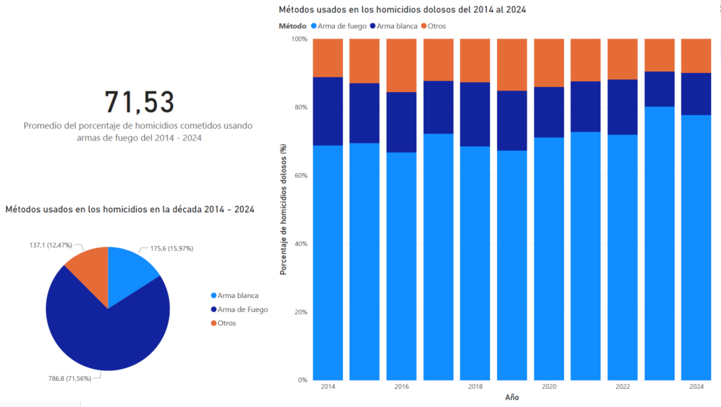 La proliferación y el fácil acceso a las armas de fuego es parte inherente a las tasas de violencia, especialmente la alta disponibilidad de armas pequeñas y ligeras.En el 2024, de los 878 homicidios cometidos, el 77,8% fueron cometidos usando armas de fuego. Este patrón se repitió año con año durante la última década, donde el porcentaje de homicidios cometidos con armas de fuego varía entre 66,4% para el 2016, y 88,69% para el 2023.