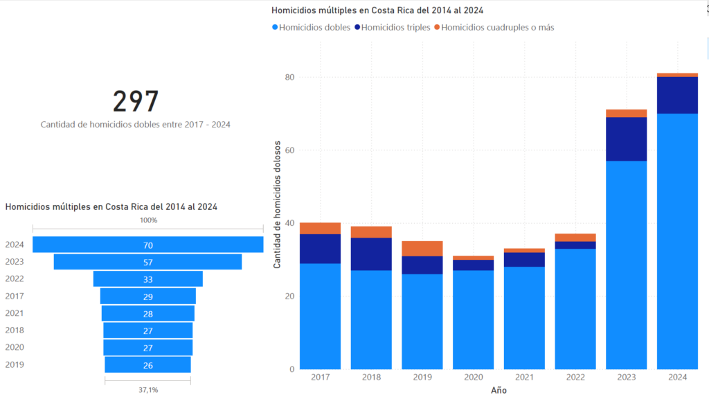 Además, la violencia se ha vuelto más compleja y visible, con un aumento significativo de los homicidios múltiples y las víctimas colaterales. Desde 2017 al 2024 los homicidios múltiples se multiplicaron más del doble, con un aumento también de los homicidios triples y cuádruples.