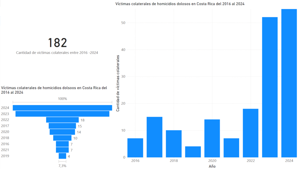 En este mismo periodo, el número de víctimas colaterales en el último año (2024) fue 13 veces superior al del año con la menor cantidad registrada (2019). Esto sugiere que los grupos criminales ya no operan en la sombra, sino que buscan sembrar miedo y exhibir su poder públicamente.