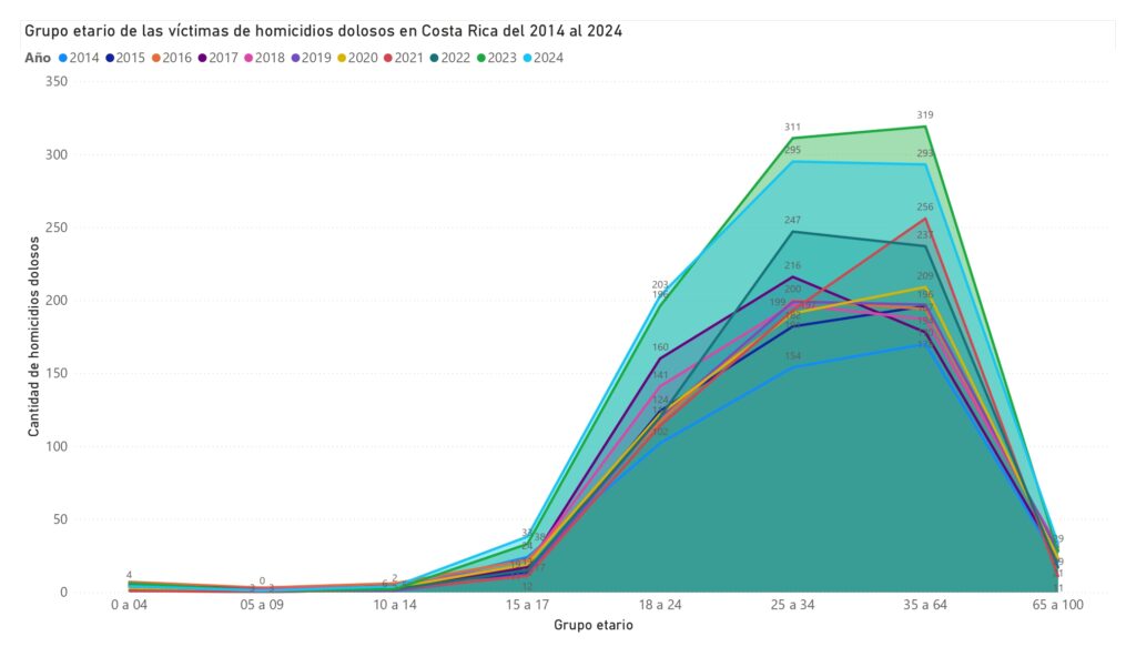 En la región de las Américas, los hombres de entre 15 y 29 años tienen una de las tasas de homicidio más altas del mundo, siendo los más vulnerables. En el 2024, el grupo etario con mayores víctimas de homicidio en Costa Rica fue entre 25 a 34 años.