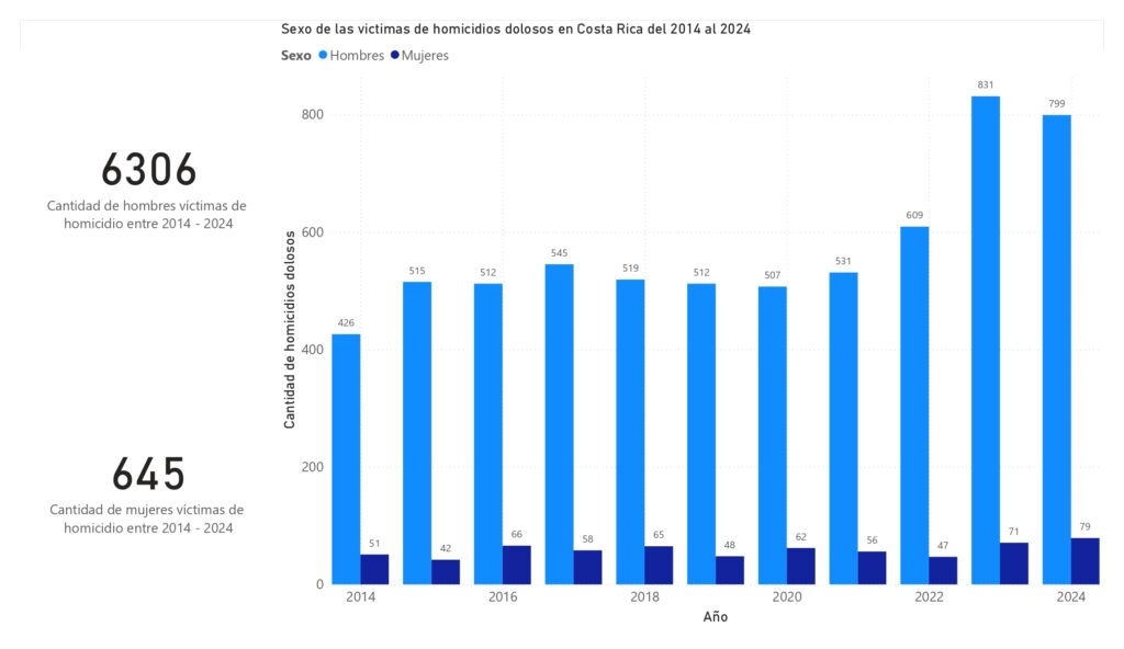 El caso de Costa Rica es un ejemplo claro: los hombres han tenido la mayor tasa de víctimas de homicidios durante la última década de forma constante. En el 2024, la tasa de homicidios de los hombres es cuatro veces mayor que la tasa de homicidio de las mujeres.
